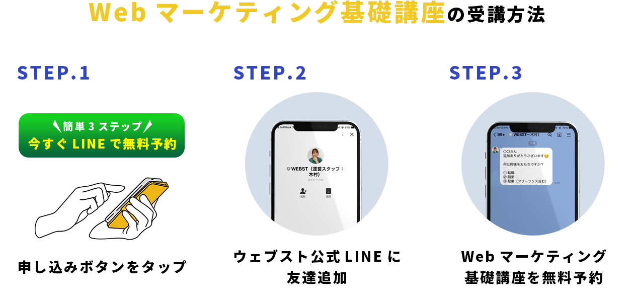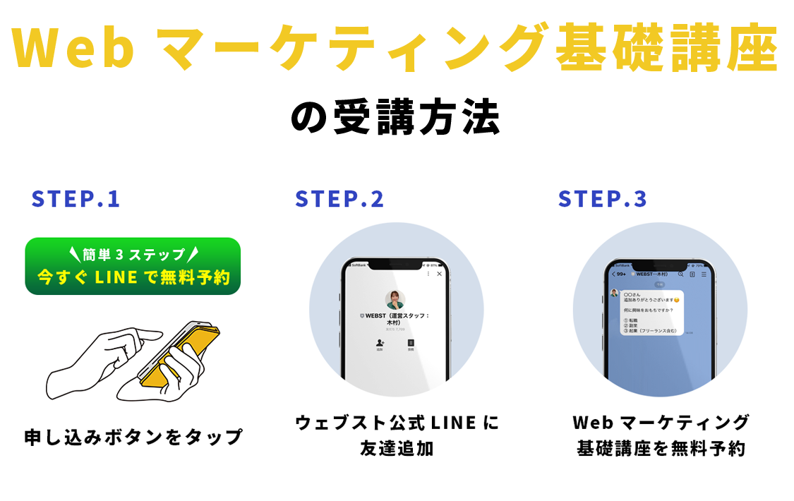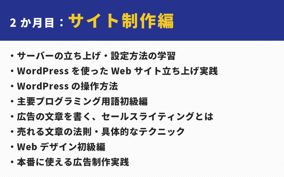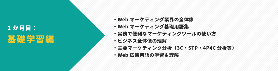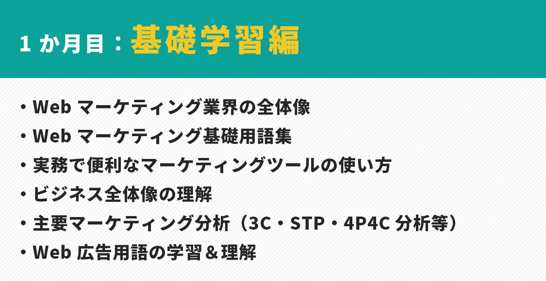 未経験からでも学べるよう、Webマーケティングの基礎からじっくり進めるカリキュラムになっています。