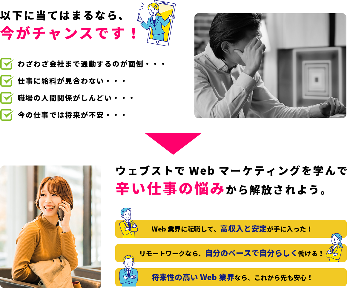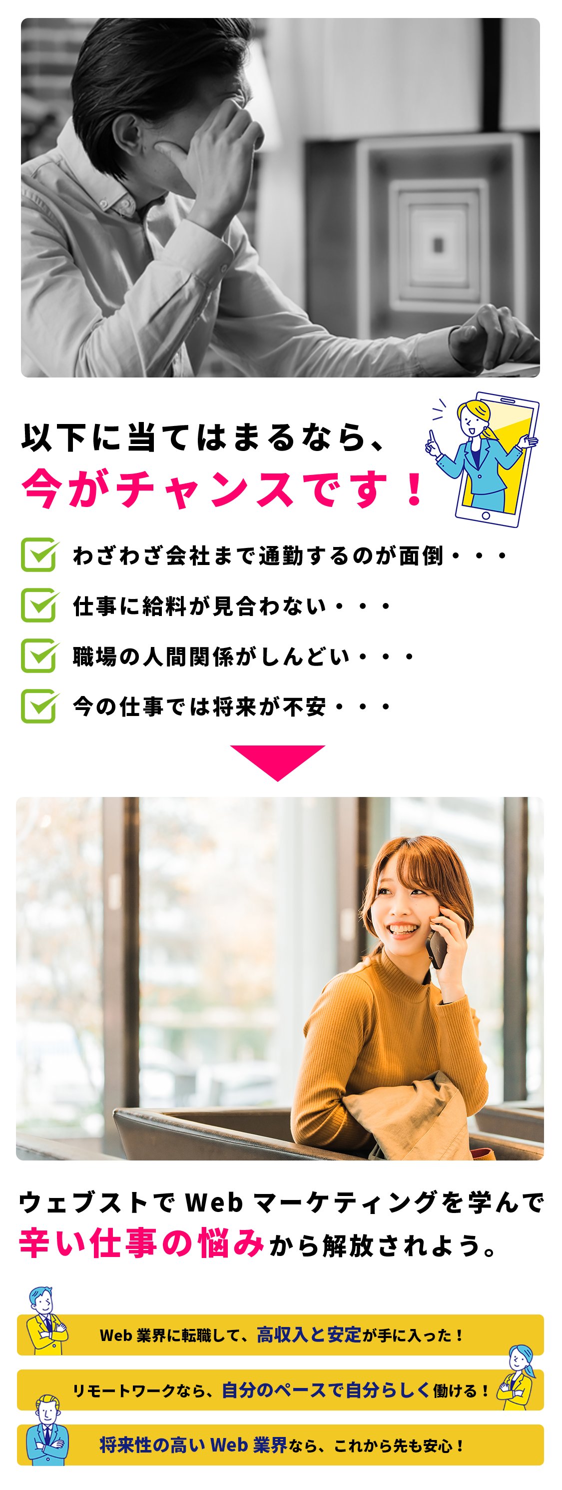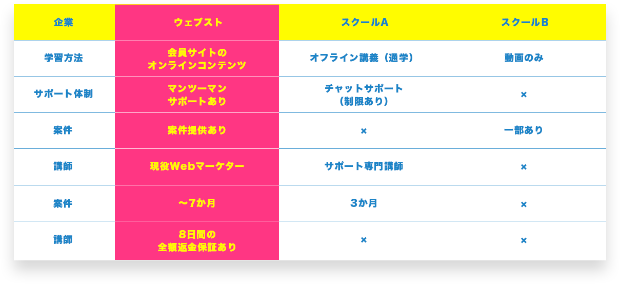 「自分でも学べるかな・・・」といった心配は不要です。ウェブストでは、現場で日々活躍するプロのマーケターが講師として”複数人”在籍しています。