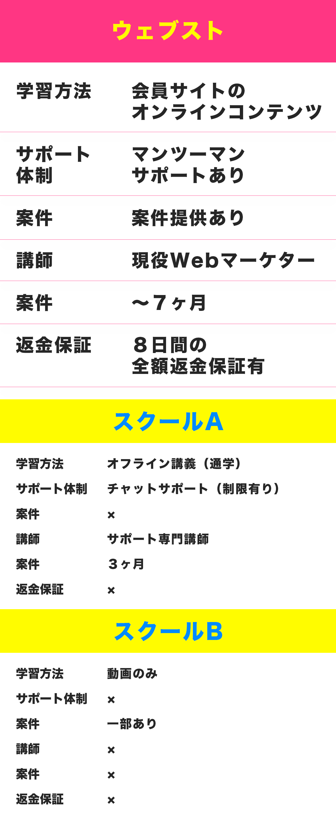 多くのWebマーケティングスクールで実践ができないという課題を解決する為に、ウェブストでは本物の広告案件を用意しています。しかも、ウェブストが用意している高単価案件をこなした際の報酬は、そのまま受講生に入ります。